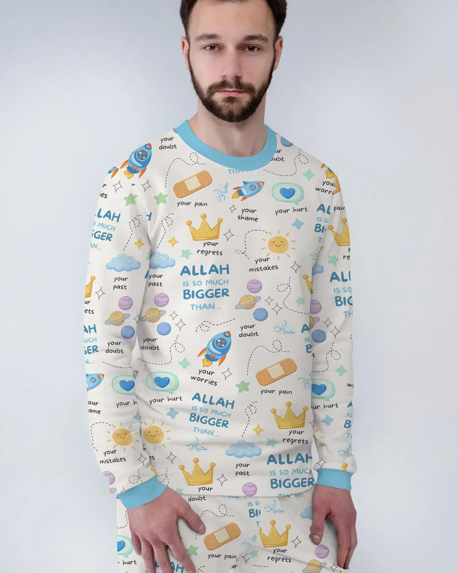 🌸 “Allah Is So Much Bigger Than…” Family Matching Bamboo Zippies & PJ Sets bring a gentle reminder of faith and hope to your little one’s everyday comfort. This uplifting design features cheerful icons—crowns, butterflies, hearts, flowers, and sunshine—surrounding the encouraging message “Allah is so much bigger than…”, reminding children that Allah’s love and mercy are greater than worries, doubts, or mistakes.