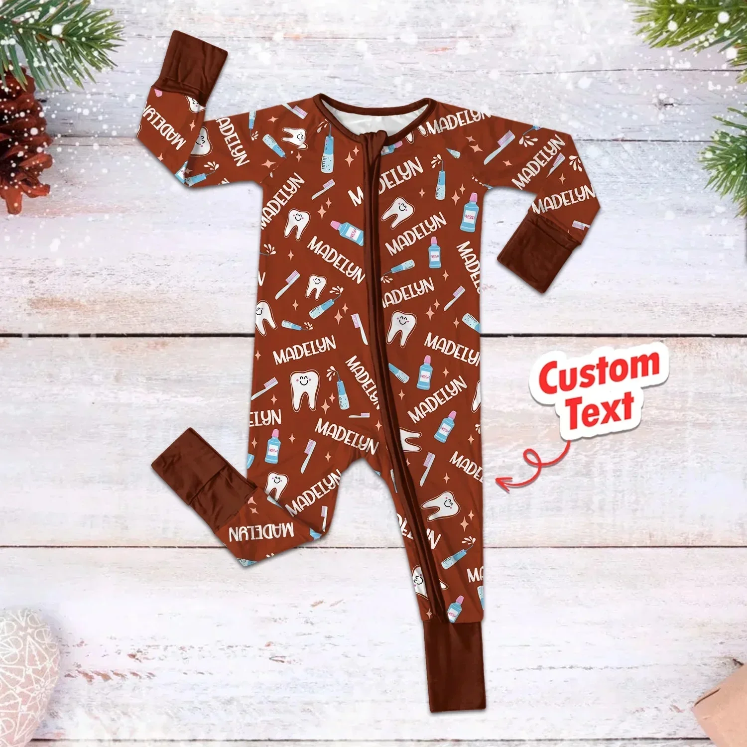 Adorned with a marvelous Brushing Teeth zippy custom name design, this romper is crafted from ultra-soft bamboo fabric, making it ideal for sensitive skin. The 2-way zipper allows for quick diaper changes, while fold-over mittens and foot cuffs enhance comfort. No snaps, buttons, or tags for irritation-free wear.