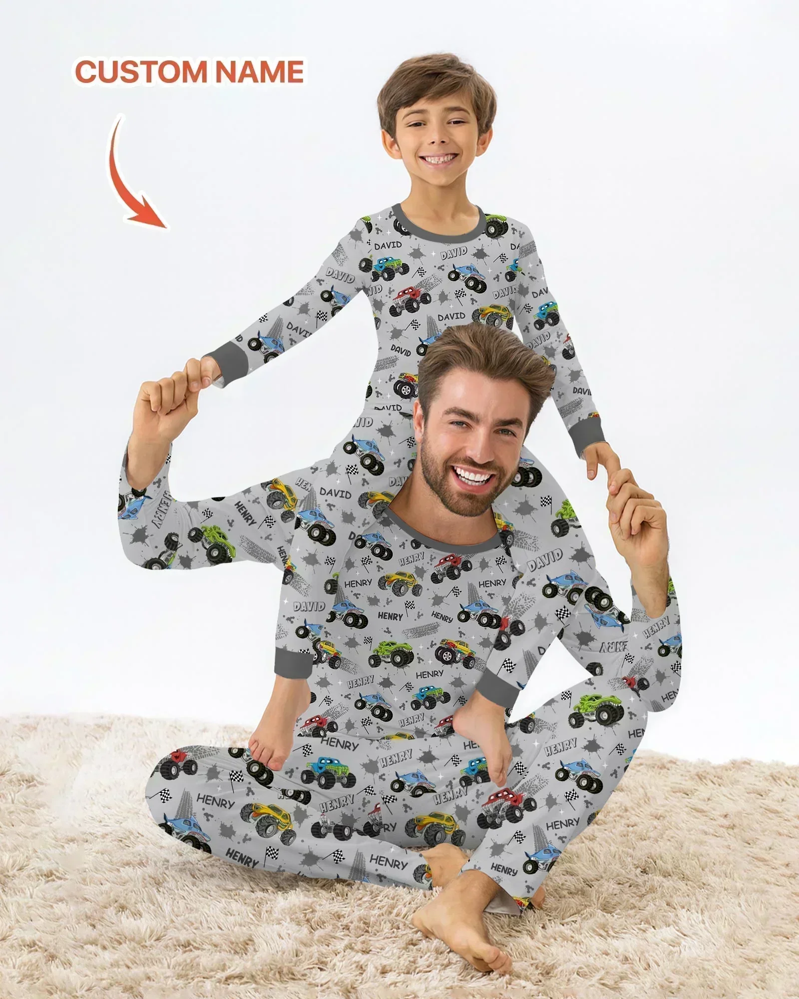 Monster Truck Dirt Jam Custom Name Daddy & Me Matching Two Piece Long Sleeve Pajama Set