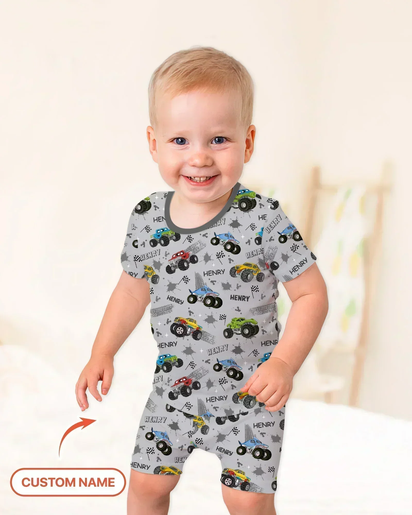 -70%Monster Truck Dirt Jam Custom Name Daddy & Me Matching Two Piece Short Sleeve Shorts Pajama Set—