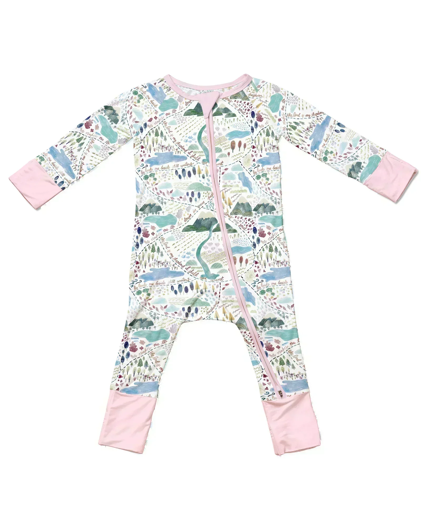 🗺️ Whimsical Psalms 23 Map Bamboo Zippies & PJMS bring the comforting words of Psalm 23 to life in a playful, hand-drawn map pattern. Featuring mountains, streams, and cozy landscapes, this design guides little ones through “He restores my soul” in a fun, visual way.